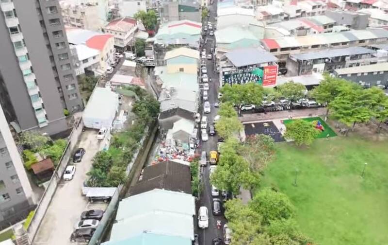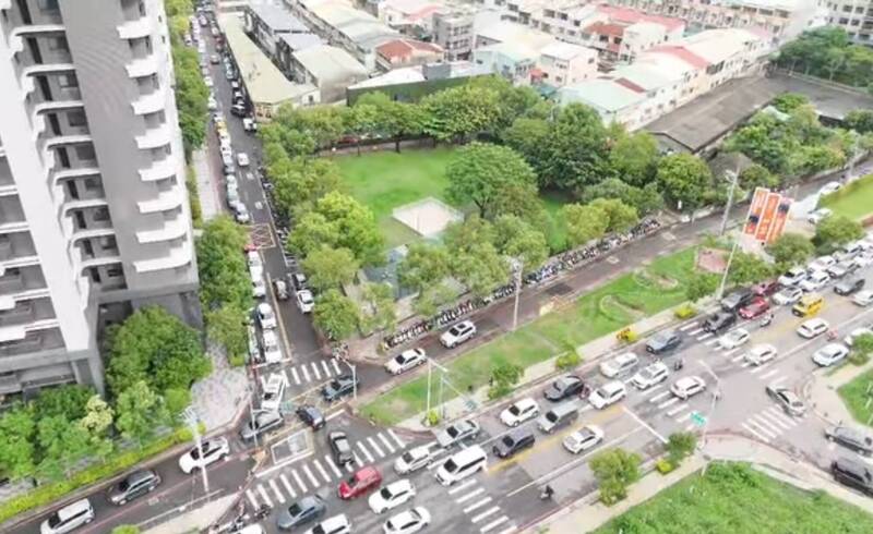 當地四民里里長江麗慧PO出民眾提供的空拍影像,車流從環中路一路擁塞,沿著崇德路、長生巷到四平路巷弄一路回堵近2公里,如大型停車場,每個路幾乎大結,車輛動彈不得。