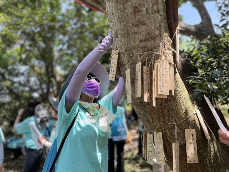 參與種樹的民眾,親筆在竹片上寫上祝福祈願語並掛在樹上。(佛光山提供)