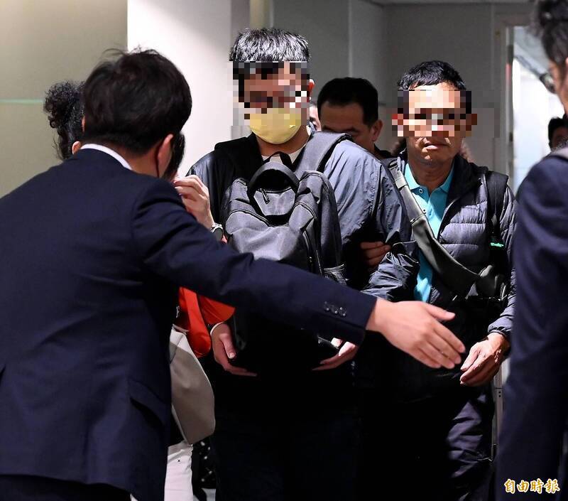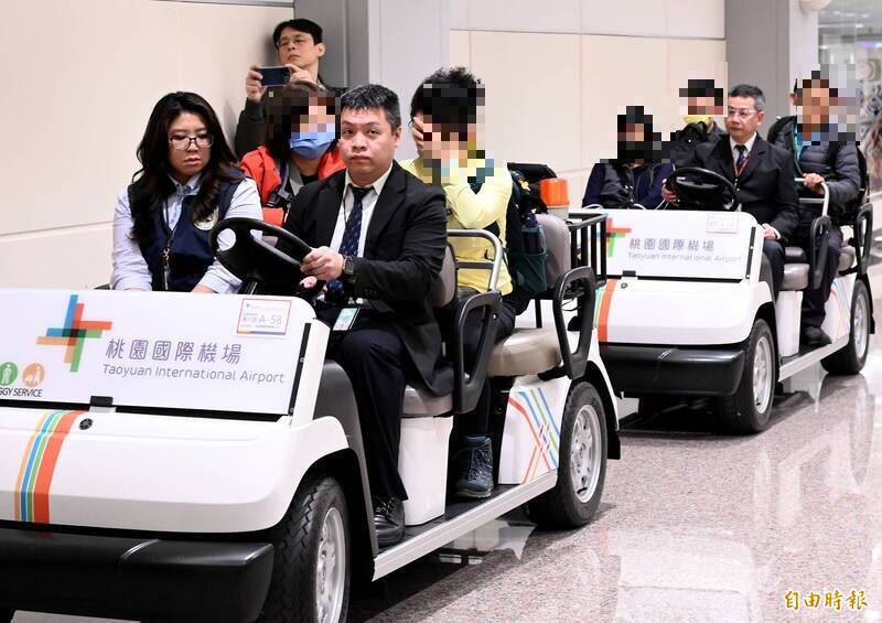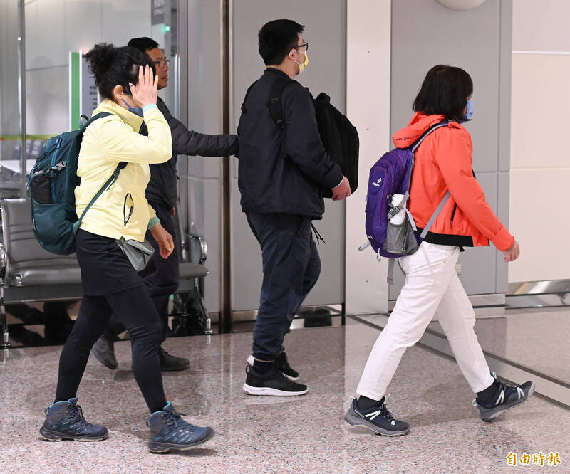 台灣旅行團24日在甘肅發生翻車事故,2名前往當地處理後續的家屬,帶著骨灰與2名同團傷者下午搭機返抵桃園機場。(記者朱沛雄攝)
