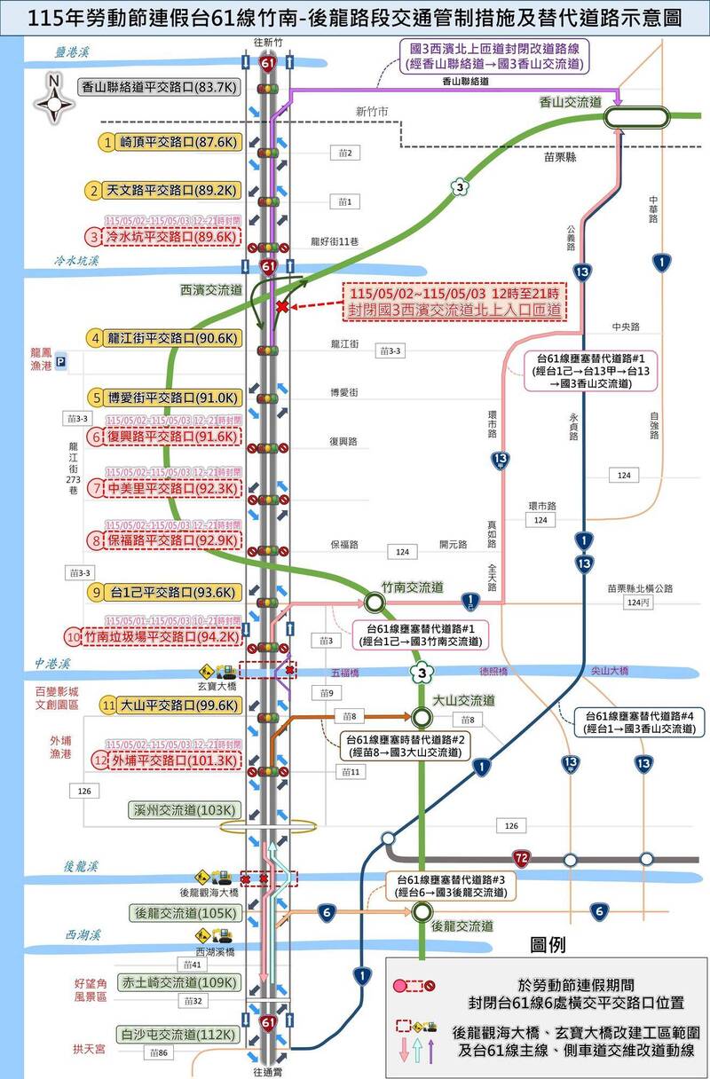 苗縣府交通工務處指出,公路局將針對台61線竹南至後龍段沿線12處平交路口,依據現場即時車流狀況機動調整號誌總週期,採取「優化遞亮」方式減少主線停等紅燈時間,並協同竹南警察分局警力於現場指揮。而在路口封閉方面,將採取兩階段管制:竹南垃圾場小路將於5月1日至3日每日上午10點至晚間9點封閉;冷水坑(龍好街11巷)、復興路、中美里、保福路及苗11線(大山腳路)等 5 處路口,則於5月2日至3日每日中午12點至晚間9點實施封閉。