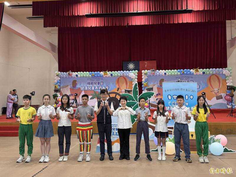 台中市模範兒童及健康兒童表揚大會,市長盧秀燕配合各校表揚兒童出各式動作姿勢。(記者歐素美攝)