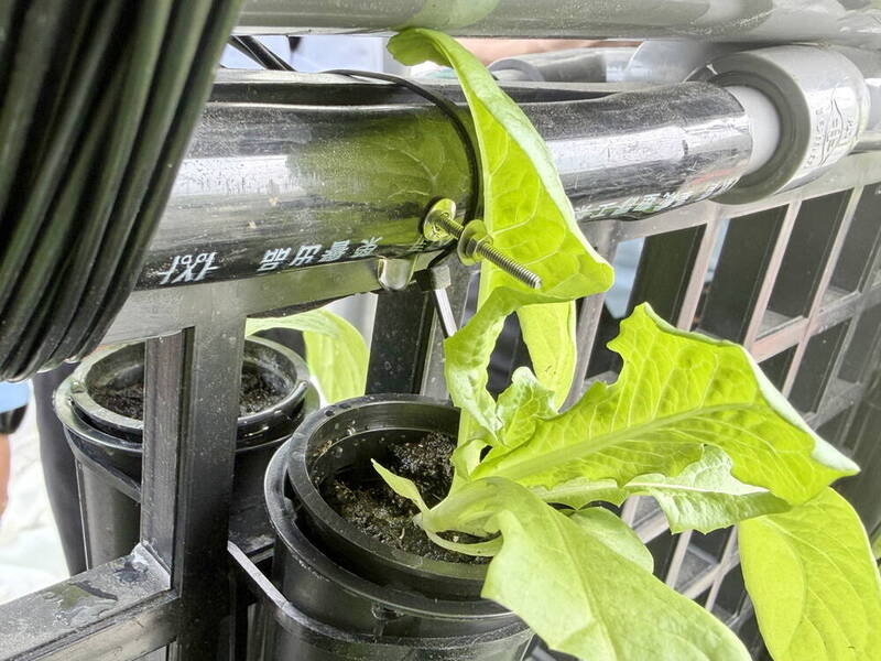 嘉大垂直式行動溫室滴灌的甜蘿蔓生菜。(圖由嘉大提供)