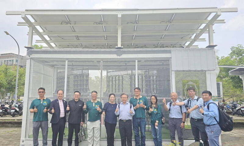 嘉大應用化學系邱秀貞副教授(左五)、台塑企業能源轉型團隊、成鑫泊極緻農業團隊於嘉大垂直式滴灌行動溫室前合影。(圖由嘉大提供)