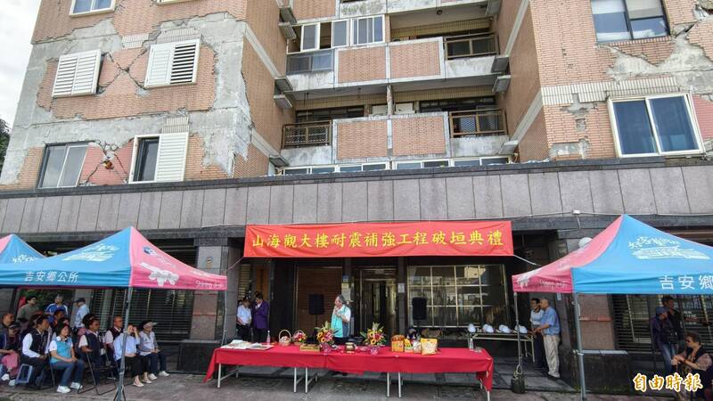 花蓮0403地震滿二年,市區仍有多棟集合式住宅高樓等待重建或是耐震補強,位於吉安鄉的集合住宅「山海觀」大樓,受強震影響,建物外牆龜裂、磁磚剝落,在中央補助近五千萬,歷經三次流標,終於在今天舉行耐震補強修繕動工典禮,預計2028年完工。