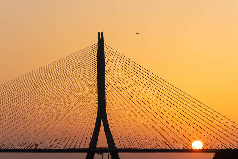 未來的淡水河口不不僅有落日餘暉的夕陽美景,更能近距離欣賞大橋斜張線條與暮色交織。(新北市觀光旅遊局提供)