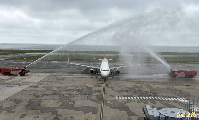 「金門—越南芽莊直航雙向包機」,首發航班由越捷航空(VietJet Air)執行飛行任務,降落金門尚義機場受到「水門禮」歡迎。(記者吳正庭攝)