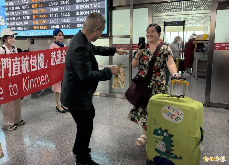 「金門—越南芽莊直航雙向包機」啟動,金門縣副縣長陳祥麟(左)前往機場迎賓並送上金門限定文創紀念品。(記者吳正庭攝)