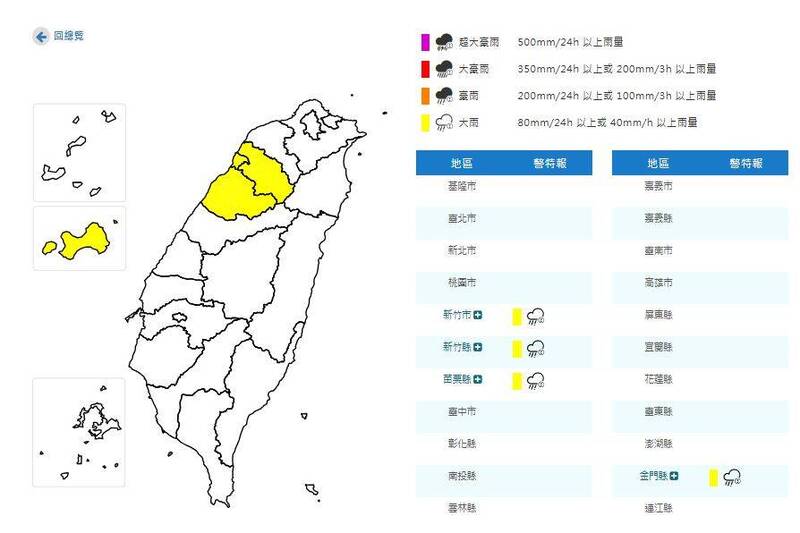 大雨特報範圍:新竹市東區、北區、香山區;新竹縣竹北市、竹東鎮、新埔鎮、關西鎮、湖口鄉、新豐鄉、芎林鄉、寶山鄉、峨眉鄉、橫山鄉、北埔鄉、尖石鄉、五峰鄉;苗栗縣苗栗市、苑裡鎮、通霄鎮、竹南鎮、頭份市、後龍鎮、公館鄉、銅鑼鄉、頭屋鄉、三義鄉、西湖鄉、造橋鄉、三灣鄉、卓蘭鎮、大湖鄉、南庄鄉、獅潭鄉、泰安鄉;金門縣金城鎮、金沙鎮、金湖鎮、金寧鄉、烈嶼鄉、烏坵鄉。