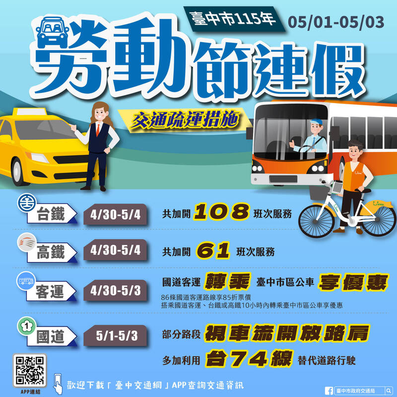 首次全國放勞動節適遇連假,中市交通局提紓解交通攻略。(市府提供)
