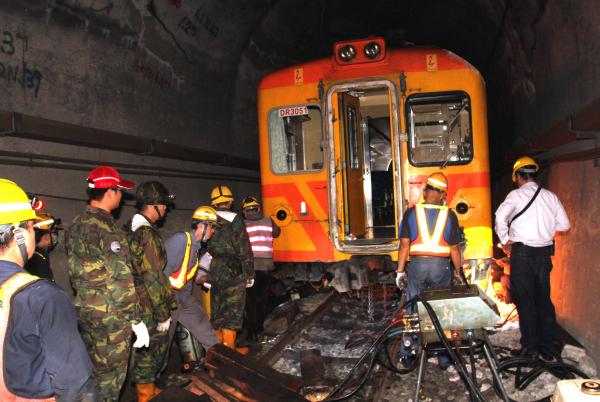台鐵自強號在南迴鐵路枋山二號隧道遇上土石流,車身脫軌卡在隧道內,工程人員搶救脫軌的車頭。(記者張忠義攝)