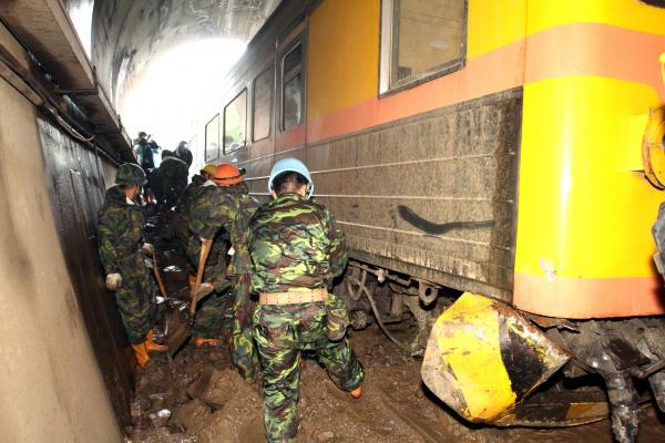 自強號遭土石流卡在隧道內,國軍弟兄幫忙搶救,清理土石。(記者張忠義攝)