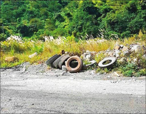 廢棄輪胎堆到無處可放,被暫置在濁水溪畔。(記者鄭鴻達翻攝)