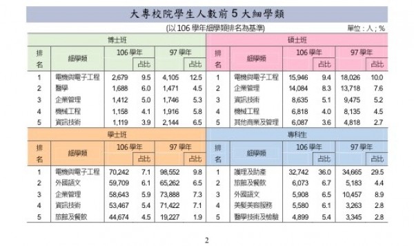 至於大專生就讀科技類比例大降,唐彥博則認為,早期推兩兆雙星,半導體產業興盛,就讀科系偏向科技類,如今未見政府再推重大政策引導,甚至最近還傳出宏達電等科技大廠裁員警訊,學生就讀科系當然受影響。