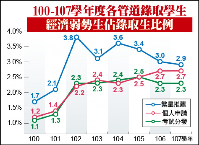 招聯會最新統計過去八年、逾八十萬筆錄取學生的家庭資料更證實,在繁星、申請、考試分發三管道中,家庭低收入、中低收入的弱勢生錄取率其實差不多,繁星約一點七%至二點九%,申請約一點二%至二點七%,考試分發則反而僅約一點一%至二點三%。看不出經濟弱勢生在多元申請等管道會更大障礙,繁星在各年度的比例較高。