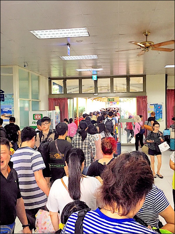 布袋商港旅客服務中心擠滿搭船人潮。(記者蔡宗勳翻攝)