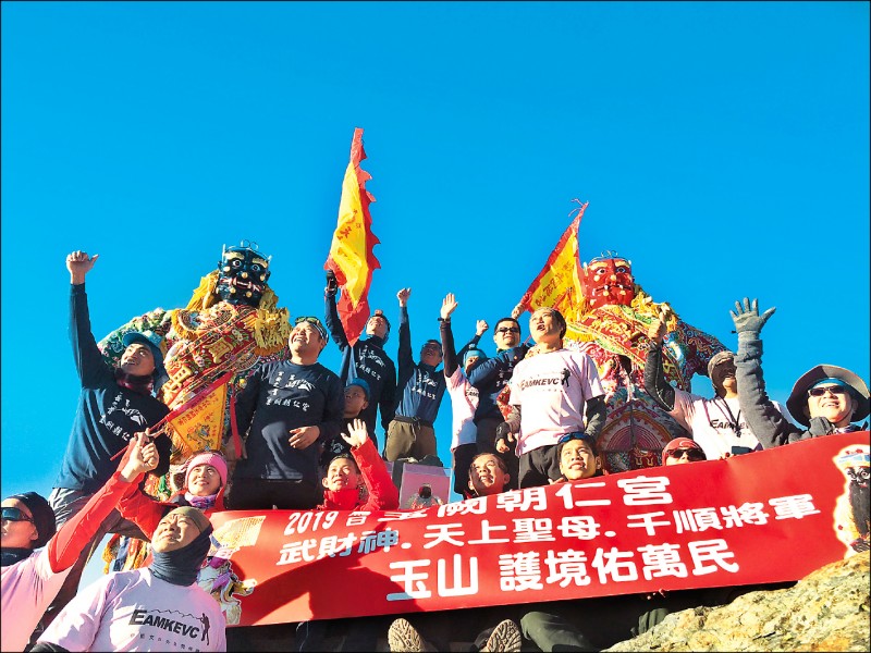登頂了!台中市玉闕朝仁宮「莊儀團」12位成員,昨天凌晨3點半從排雲山莊出發,眾人輪流揹著媽祖、武財神神像及扛著各重30公斤、高近3米的千里眼及順風耳神將,爬了近3個小時,終於登上玉山山頂,登頂一刻忍不住激動哭了。