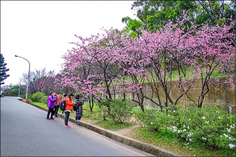 龜山壽山巖觀音寺後山公園周邊的山櫻、吉野櫻等已盛開。(壽山巖觀音寺提供)