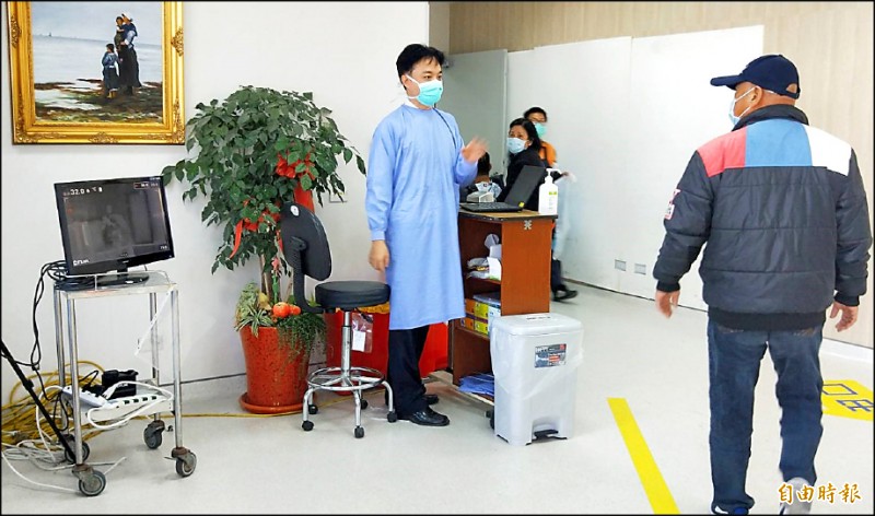 佳里奇美醫院模擬測試入院的民眾先量測體溫,再插健保卡讀卡。(記者楊金城攝)