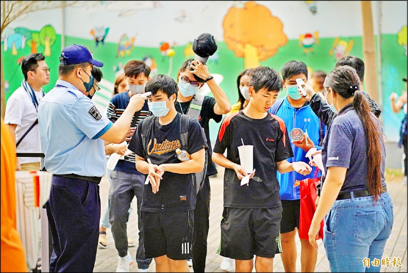 民眾進球場前需先量額溫及噴酒精。(記者黃志源攝)