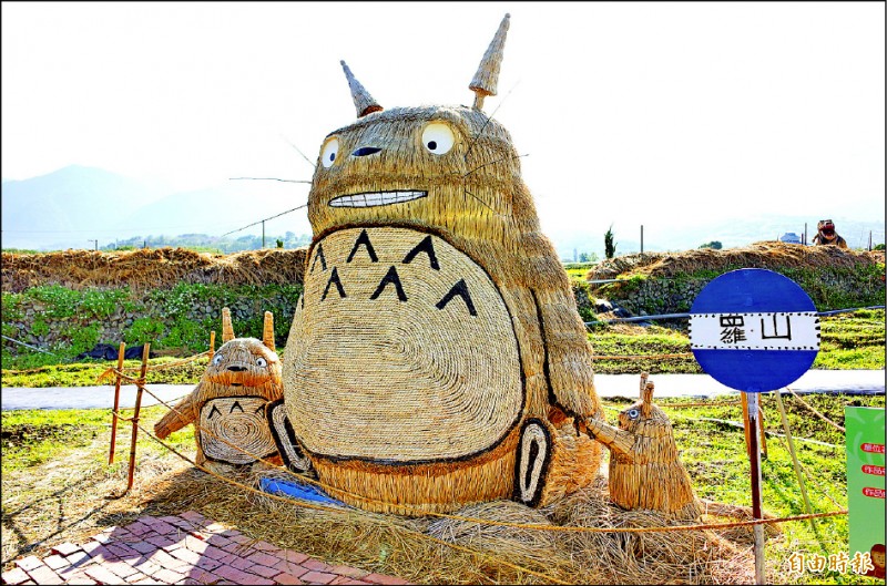 花蓮富里稻草藝術節登場,大小龍貓吸引遊客拍照打卡。(記者花孟璟攝)