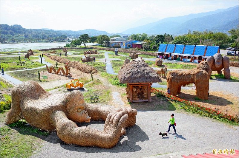 主題「動物迷蹤.沃野派對」的富里稻草藝術季,20隻可愛稻草動物現身,最吸睛的竹編大猩猩,是台南竹藝老師劉哲安的作品,牠趴在地上屁股翹得高高的,雙手比出愛心形狀形成拱門,還嘟著嘴唇向大家「討親親」,遊客得排隊才能和大猩猩拍照。