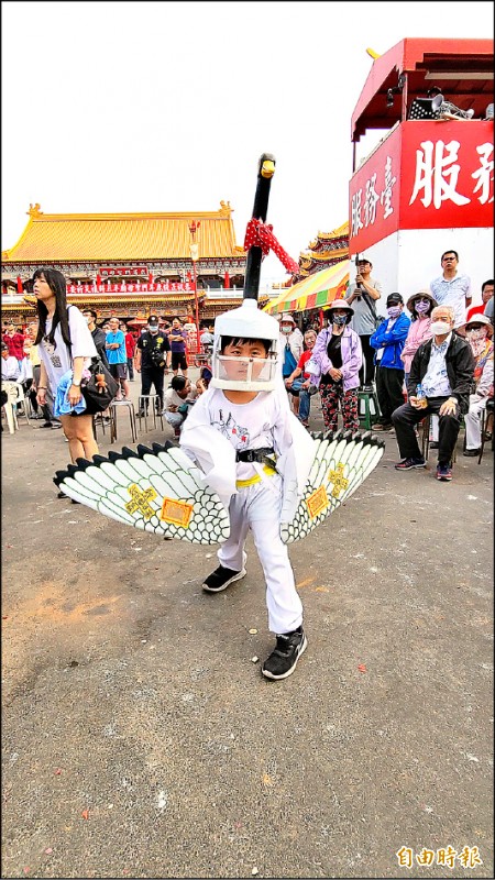 8歲的謝栯綸扮演小白鶴架勢十足。(記者劉婉君攝)