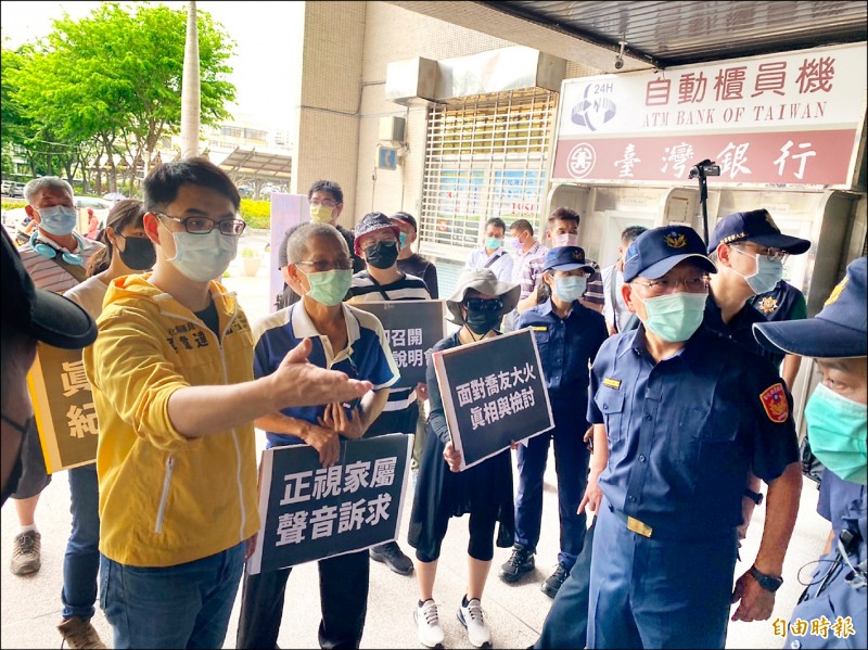 縣議員吳韋達(前左一)與喬友大樓罹難者家屬前往縣府抗議,遭大批警力包圍、阻止。(記者張聰秋攝)
