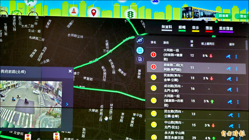 中西區建置全台首套智慧路網動態號誌系統,壅塞路段會顯示紅色警告。 (記者洪瑞琴攝)