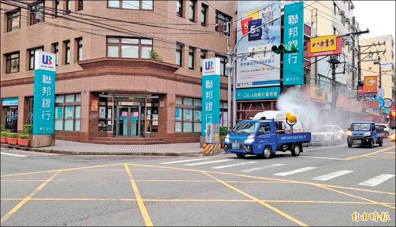 桃園市府環保局派消毒車在銀行周圍街道清消。(記者許倬勛攝)