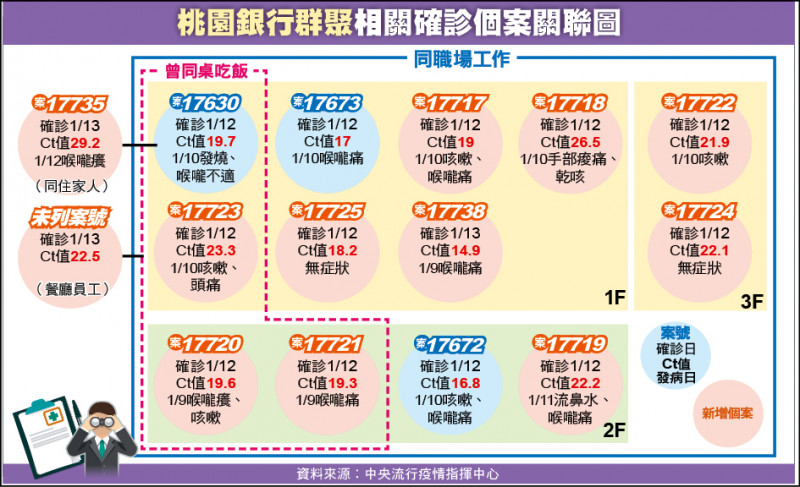 昨深夜,中壢高商有一位學生為銀行案的接觸者,是銀行員聚餐地點餐廳的員工(待編號,Ct值二十二.五)確診,該校今起停課十四天。