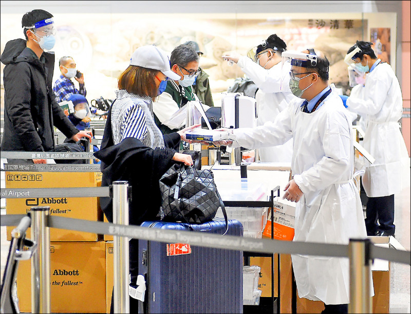 近日是海外民眾回台過年的返台高峰,因國外疫情嚴峻,連帶境外移入武漢肺炎病例大增。圖為邊境檢疫人員穿全套防疫裝備,幫旅客檢驗資料。(資料照)