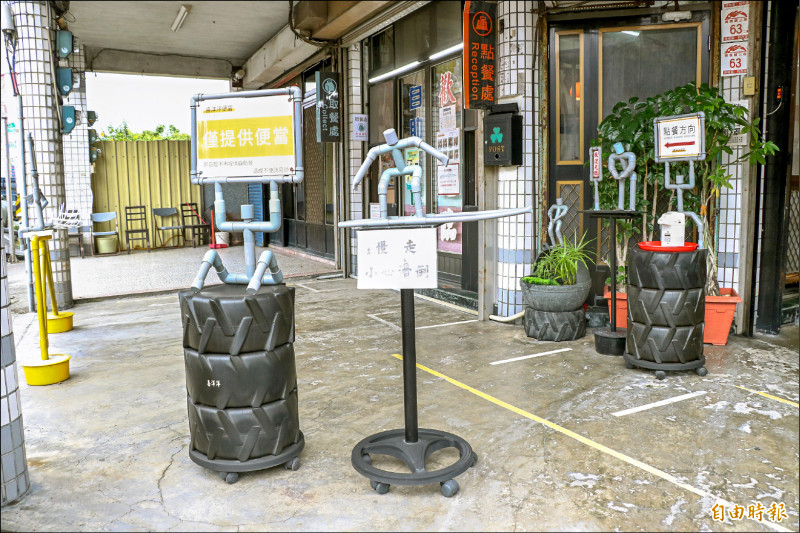 頭城鎮喜洋洋自助餐老闆黃清龍喜歡做手工藝,店門口擺設自製水管人偶招呼客人、指引動線。 (記者蔡昀容攝)