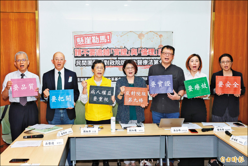 時代力量立委陳椒華(左三)等人召開「民間團體反對政院版再生醫療法第9條」記者會,質疑醫療機構執行再生技術的限制過度寬鬆。(記者王藝菘攝)