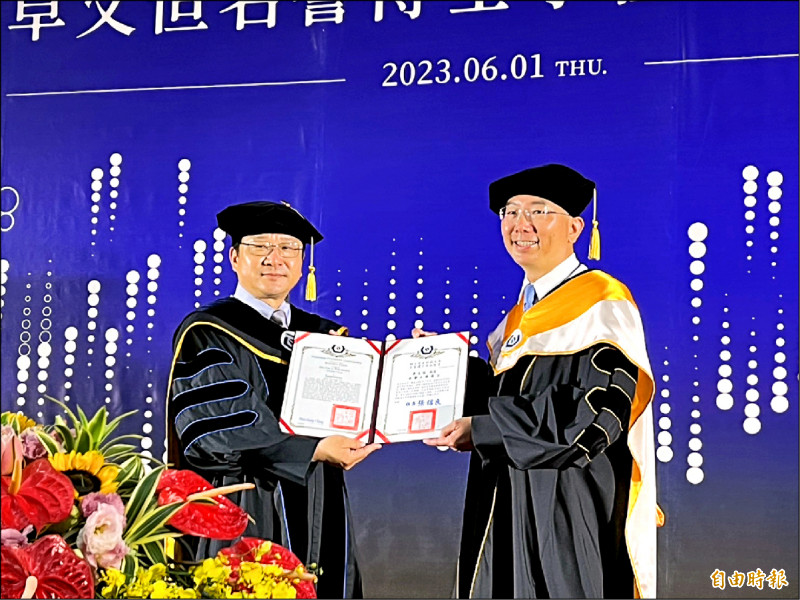 虎尾科技大學校長張信良(左)頒授上銀科技董事長卓文恒(右)名譽工學博士學位。(記者黃淑莉攝)