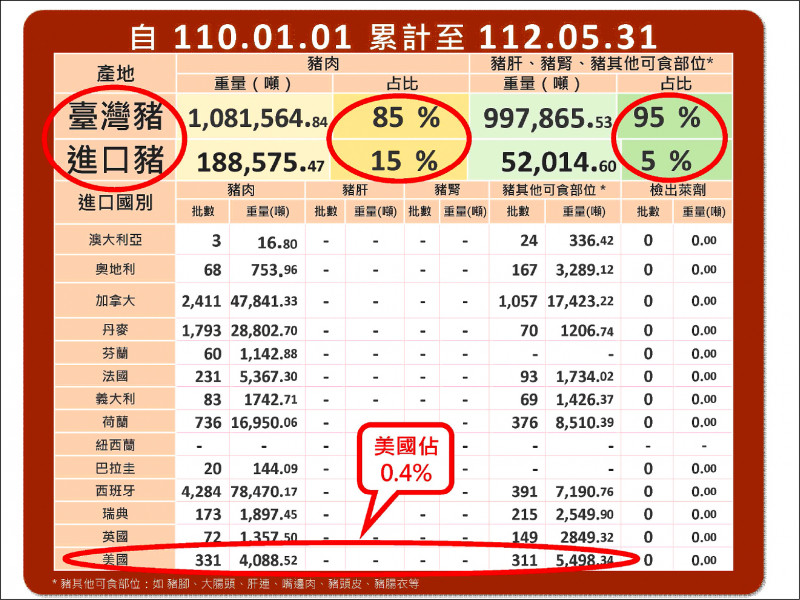 食藥署統整,從二○二一年至今年五月,各縣市查核豬肉原料原產地標示共廿二萬四六六二件次,標示美國豬肉計一五二一件次,佔比○.六%;標示不符規定的共七十二件,其中九件標示為美國,大多是因為有兩個以上的豬肉產地的標示錯誤。