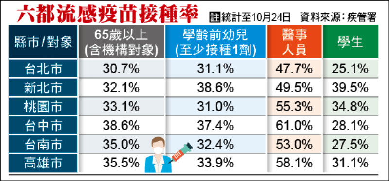 全國接種率平均值為長者卅五.五%、幼兒卅五%、醫事人員五十五.四%、學生卅一.七%。台北市依序是卅.七%、卅一.一%、四十七.七%、廿五.一%,均低於全國平均值。苗栗縣、台南市也一樣在全國平均值之下。