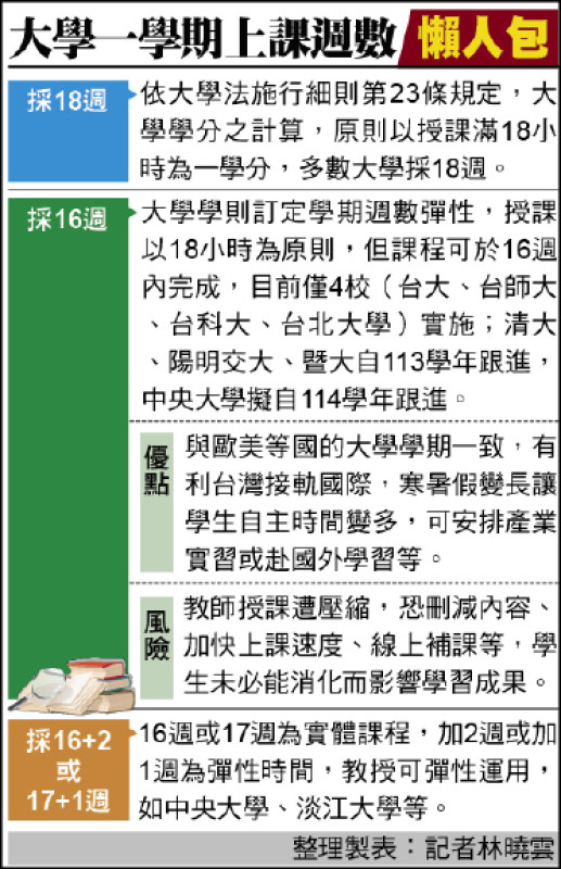 多數大學現行採一學期十八週,陽明交大教務長陳永昇表示,學校「十六加二」週實施四年後,教師多將課程精實化,十六週案獲全校師生的共識,不過,全民國防課因上課時間可折抵役期,學生都積極想上滿十八週。