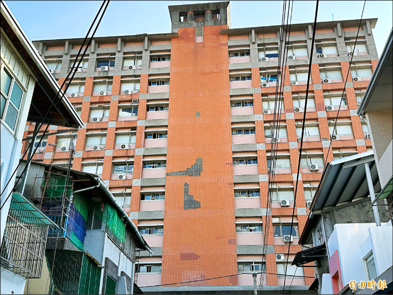 虎科大綜三館後方建築磁磚掉落,居民擔憂再次「如雨落下」,盼趕緊解決。(記者李文德攝)
