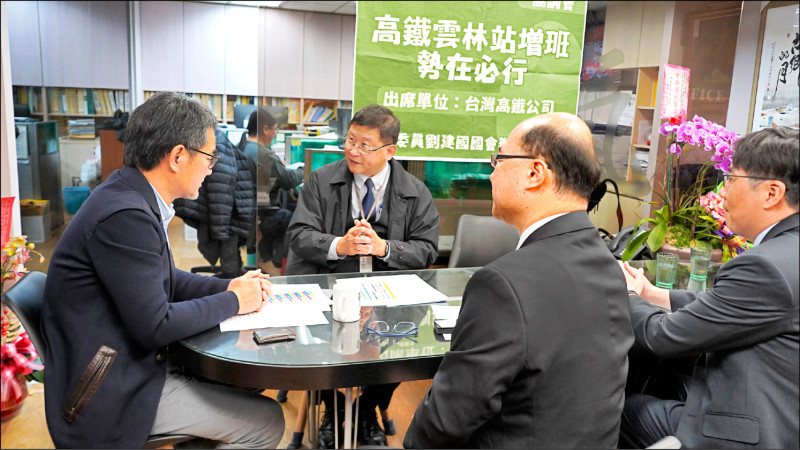 立委劉建國(左)與高鐵公司人員協調,爭取高鐵雲林站增班。(立委劉建國服務處提供)