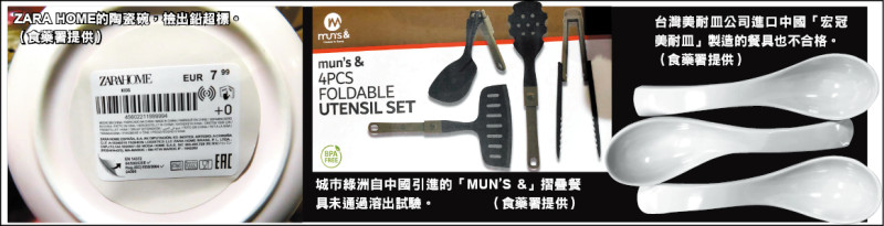 衛福部食品藥物管理署昨公布最新邊境檢驗不合格名單,共有七批產品違規,其中三批中國製餐具,分屬知名品牌ZARA HOME、城市綠洲與台灣美耐皿,出現重金屬鉛超標與溶出試驗不合格遭攔截,未流入市面。