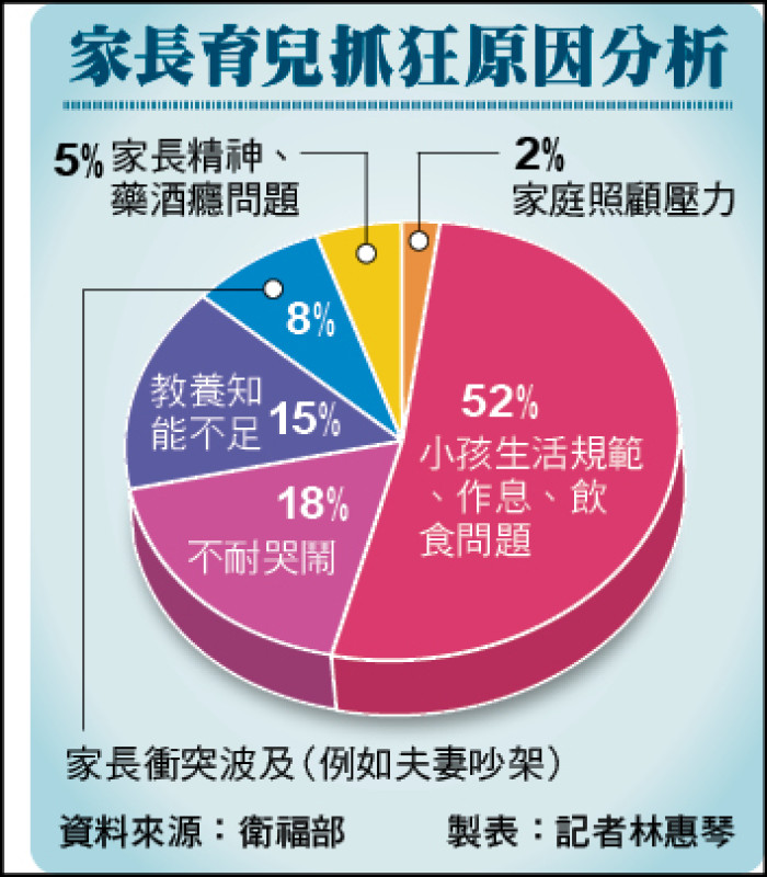 張秀鴛說明,家長抓狂原因也是孩子受虐原因,進一步分析以孩子生活規範、作息、飲食問題占五十二%為大宗,包含晚上不睡覺、吃飯吃很久、剛換尿布又漏尿、玩具亂丟、兄弟姊妹一天到晚打架、帶出門亂跑亂衝亂撞等,過去曾有重大不幸事件是孩子洗澡前已排便,洗澡過程又於澡盆大便,結果被家長失手打死。其他尚有家長不耐孩子哭鬧、教養知能不足等問題。