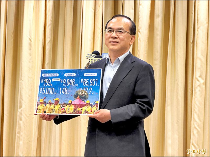 苗栗白沙屯拱天宮徒步進香一日深夜啟程,交通部啟動跨運具聯防,政務次長陳彥伯表示,進香首日雙鐵疏運七.五萬人次,較去年成長六十九%,顯示信徒踴躍搭乘公共運輸;公路局協調客運加開臨時路線「高鐵至白沙屯拱天宮」,發車一五九班、載運近五千人次。