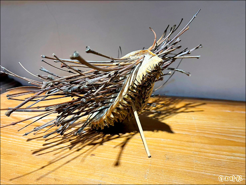 土耳其藝術家用在海口故事屋外撿到的樹枝創作。(記者黃淑莉攝)