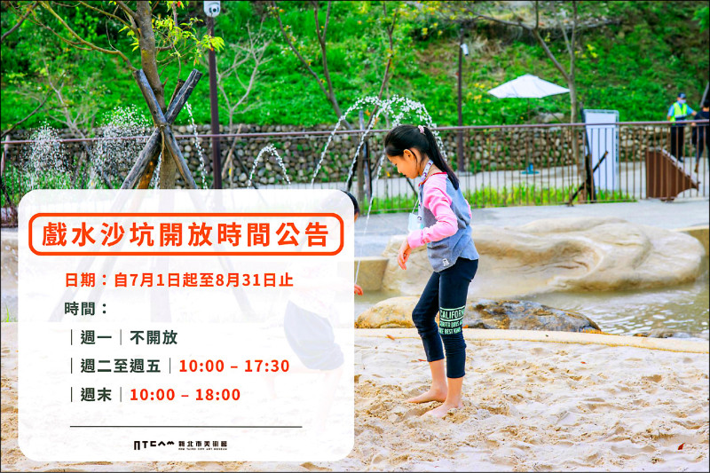 新北市美術館表示,「戲水沙坑」將於七月一日至八月卅一日的每週三至週日,平日上午十點至下午五點卅分、假日延長到晚上六點免費入場,遇天候不佳或定期清潔將彈性調整時間,公告在官網與社群平台。