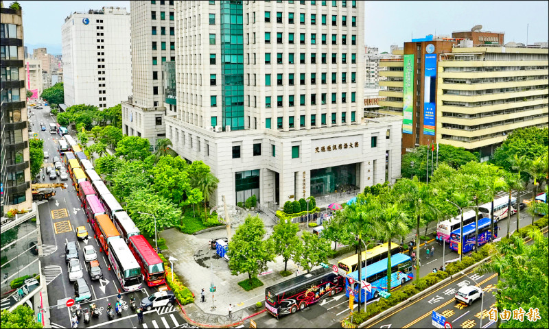 明年元旦起,全台遊覽車強制裝設駕駛身分識別設備,新北市遊覽車駕駛員職業工會質疑圖利,昨號召全台200輛遊覽車包圍交通部陳抗。(記者羅沛德攝)