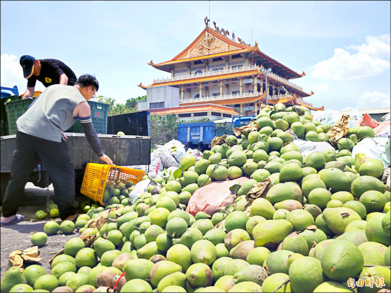 農民將落果文旦撿拾、裝籃後,載至暫置點堆放,等待農會清運。(記者吳俊鋒攝)