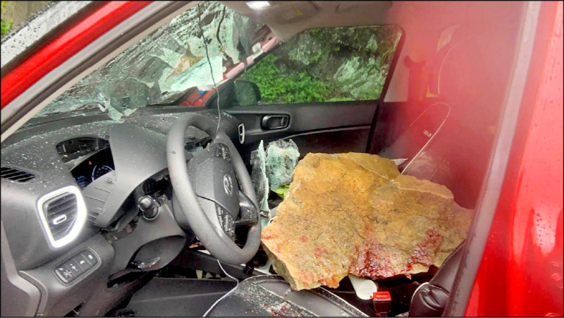 此外,蘇花公路台九線東澳路段,昨天上午發生落石砸車意外,一顆直徑約三十公分的石塊,砸破一輛紅色休旅車前擋風玻璃掉進車內,造成前座的呂姓夫妻受傷送醫,後座小孩幸運逃過一劫。交通部公路局東區養護工程分局表示,該處邊坡施做型框植生保護後,已有多年沒有落石,這次事故研判薇帕颱風外圍環流強降雨影響,高位邊坡土石鬆動釀災。