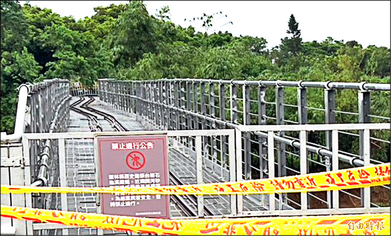 台糖石龜溪鐵橋不堪湍急溪水沖刷橋墩傾斜,鐵軌扭曲變形,拉起封鎖線禁止通行。(記者黃淑莉攝)