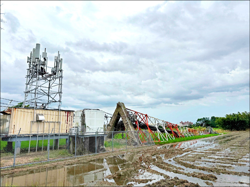 台灣大哥大嘉義縣民雄社溝45公尺高基地台遭颱風摧毀,工程團隊緊急搭建臨時基地台,讓周邊區域初步恢復訊號。(台灣大哥大提供)
