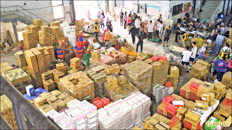 各方愛心物資不斷湧入,目前物資倉都已滿倉。(記者王錦義攝)